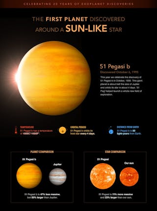 V roce 1995 objevili Mayor a Queloz obří exoplanetu obíhající kolem hvězdy podobné Slunci, 51 Pegasi. Planeta, známá jako 51 Peg b, měla podobnou hmotnost jako Jupiter, ale byla 100krát blíže své hostitelské hvězdě, díky čemuž měla teplotu přes 1000 ℃. Tento objev byl v mnoha ohledech radikální, v neposlední řadě proto, že se zcela lišil od planet v naší sluneční soustavě a odporoval teoriím o vzniku a vývoji planet.