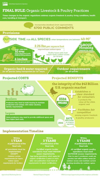 Damit ein Tier als biologisch gekennzeichnet werden kann, legt das USDA mehrere Standards fest. Ein Bio-Tier muss nicht nur Bio-Futter fressen und frei von Hormonspritzen sein, sondern auch Zeit im Freien verbringen und genügend Platz haben, um so zu leben, wie es das USDA definiert.